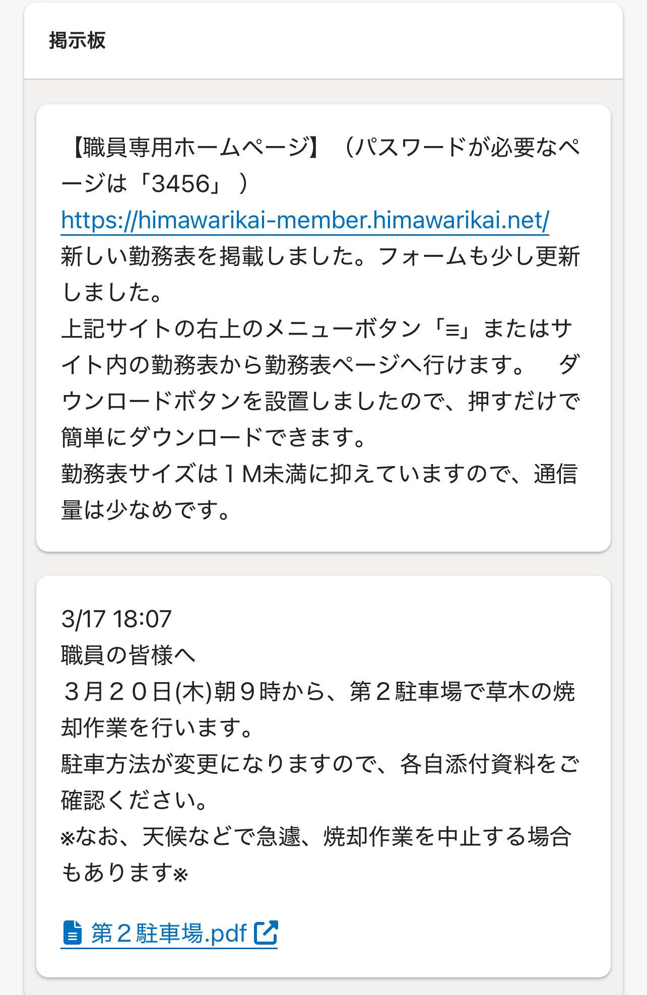 委員会からのお知らせやGoogleフォーム等回答依頼などが表示されています。 掲示板よりも狭い範囲(施設、部署ごと)への連絡ツールです。